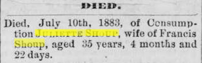 Francis Fremont ShoupBirth: February 8, 1851 56 44 — Richland Twp., OH Death: January 9, 1934 — Defiance, OH |