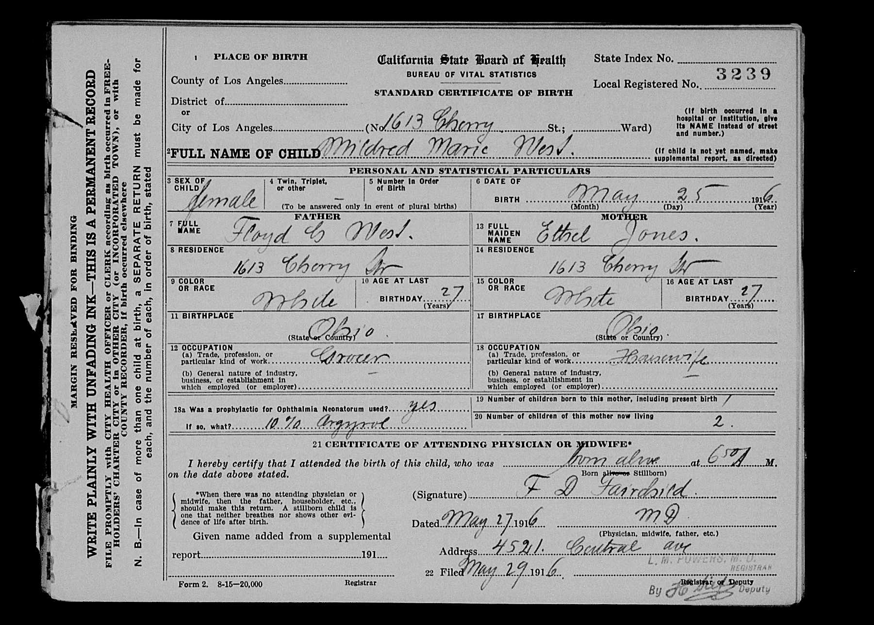 | Media object | Mildred West Birth Certificate.jpg Format: image/jpeg Image dimensions: 1,801 × 1,287 pixels File size: 256 KB Type: Photo |