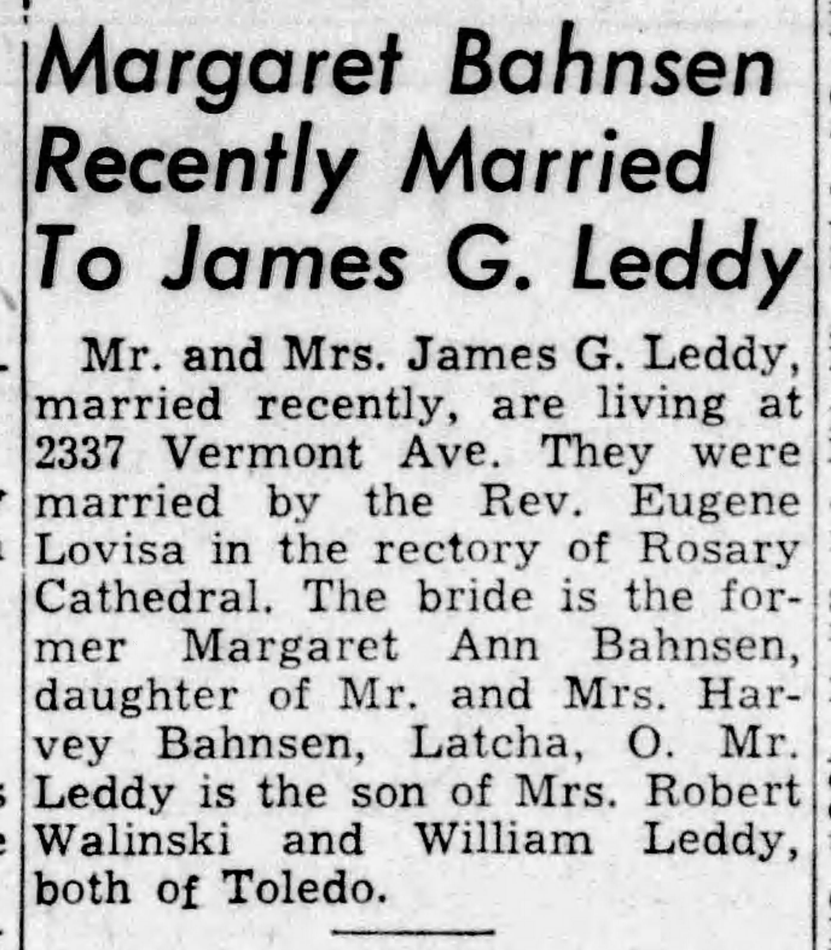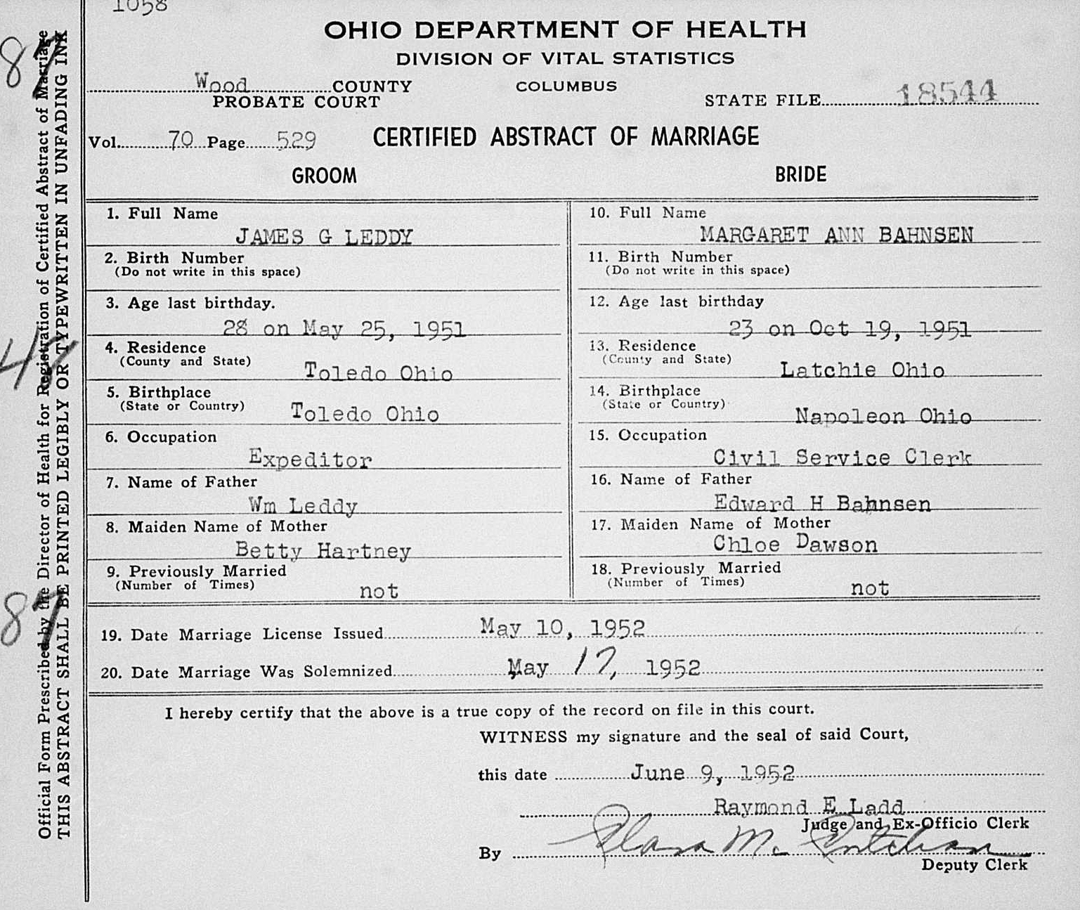 | Media object | James Leddy_Margaret Bahnsen marriage certificate.jpg Format: image/jpeg Image dimensions: 1,537 × 1,295 pixels File size: 1,137 KB Type: Photo |