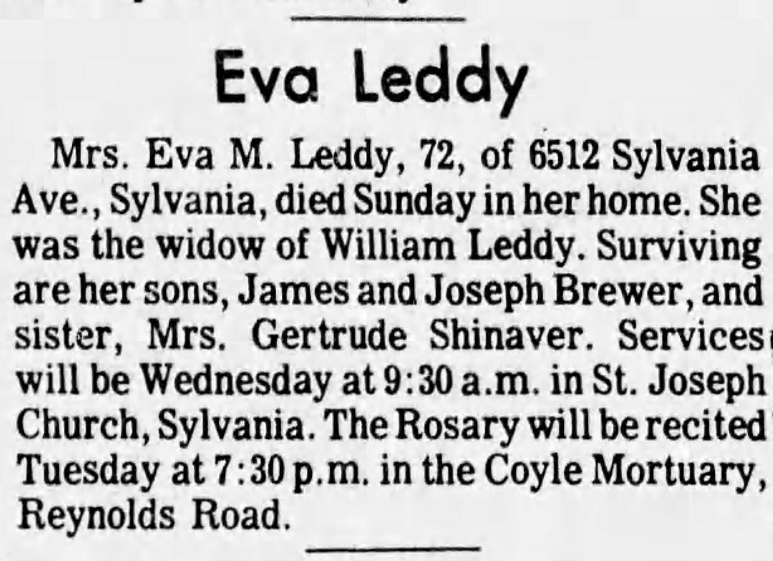 | Note | Probate court records from Sept/1960 show Eva Leddy as surviving spouse of Wm Leddy. |