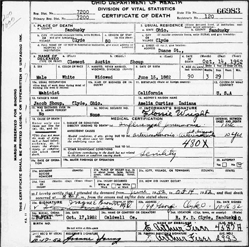 | Media object | Clement Shoup Death Cert.jpg Format: image/jpeg Image dimensions: 500 × 495 pixels File size: 122 KB Type: Photo |