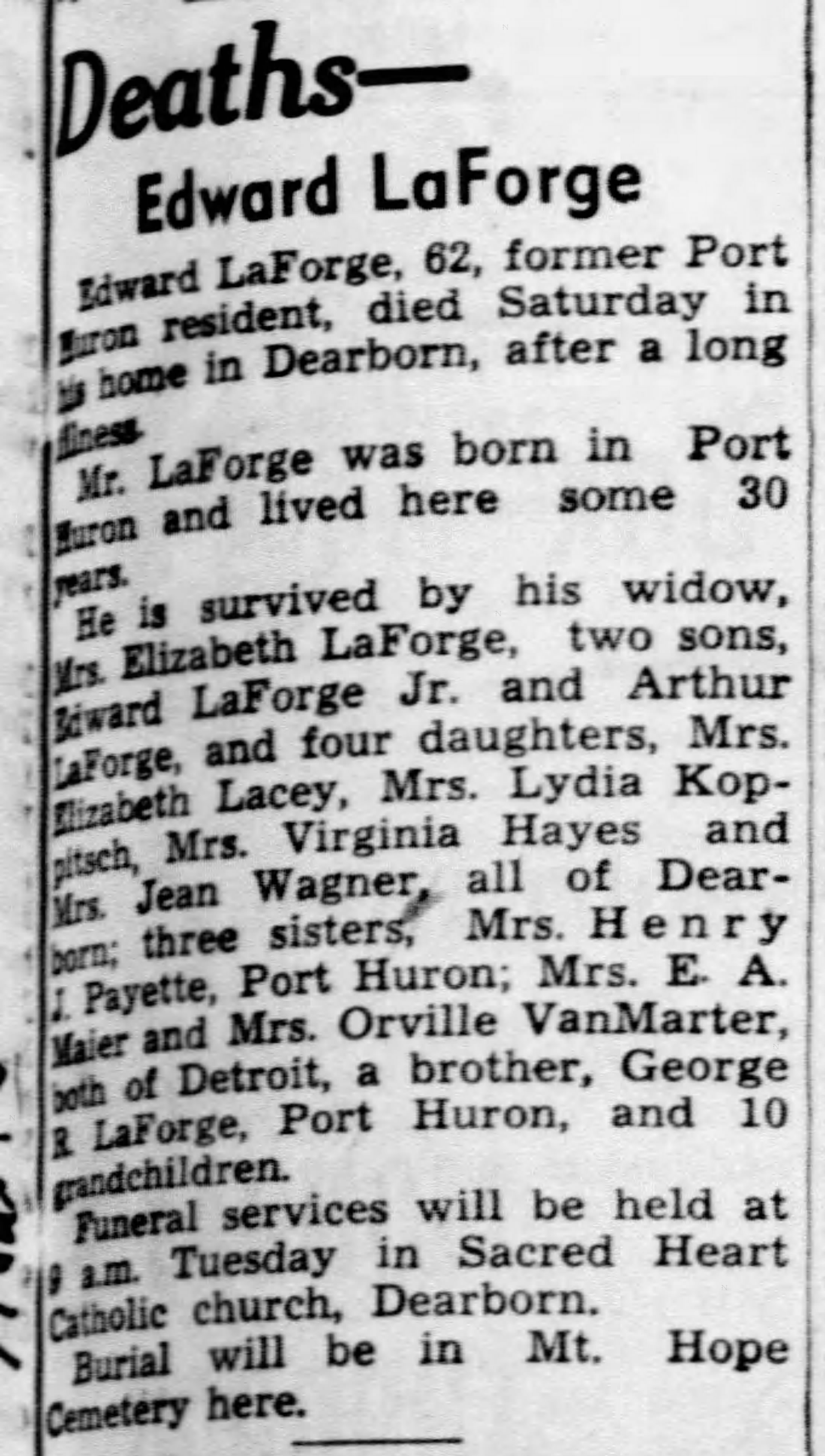 | Media object | EdwardaForgeObit_The_Times_Herald_1949_02_07_Page_5.jpg Format: image/jpeg Image dimensions: 2,193 × 3,871 pixels File size: 655 KB Type: Photo Note: Obit says born in Port Huron, MI, but other info says born in Ontario & immigrated at the age of 2.