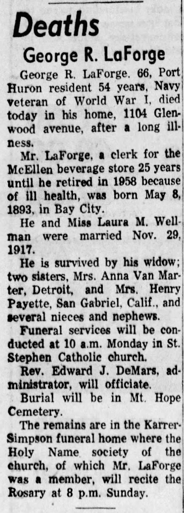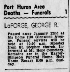 | Media object | George LaForge Death Notice PortHuron TimesHerald 24Jan1960.JPG Format: image/jpeg Image dimensions: 285 × 292 pixels File size: 28 KB Type: Photo |