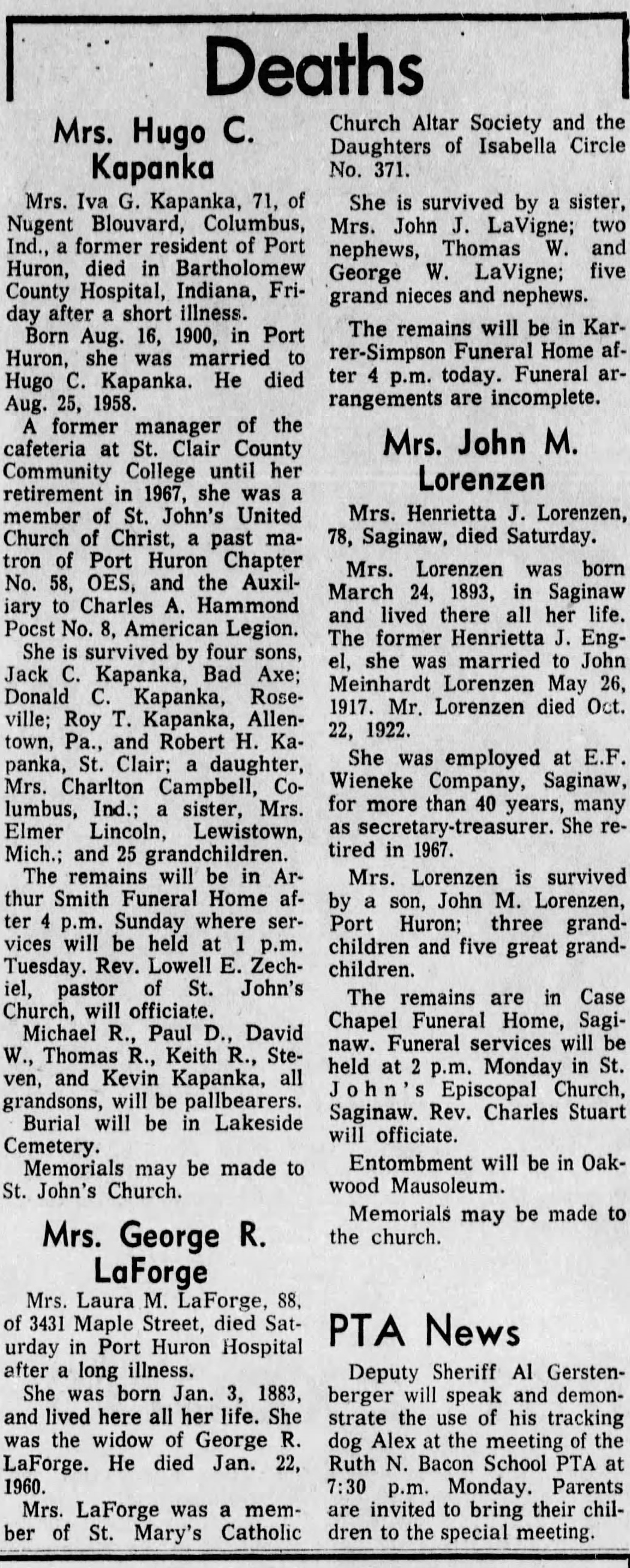 | Media object | Laura Wellman LaForge Funeral Notice PortHuron TimesHerald 13Dec1971.JPG Format: image/jpeg Image dimensions: 228 × 426 pixels File size: 32 KB Type: Photo |