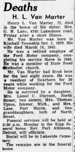 | Media object | Henry Van Marter obit PortHuron TimesHerald 01Dec1951.JPG Format: image/jpeg Image dimensions: 249 × 502 pixels File size: 44 KB Type: Photo |