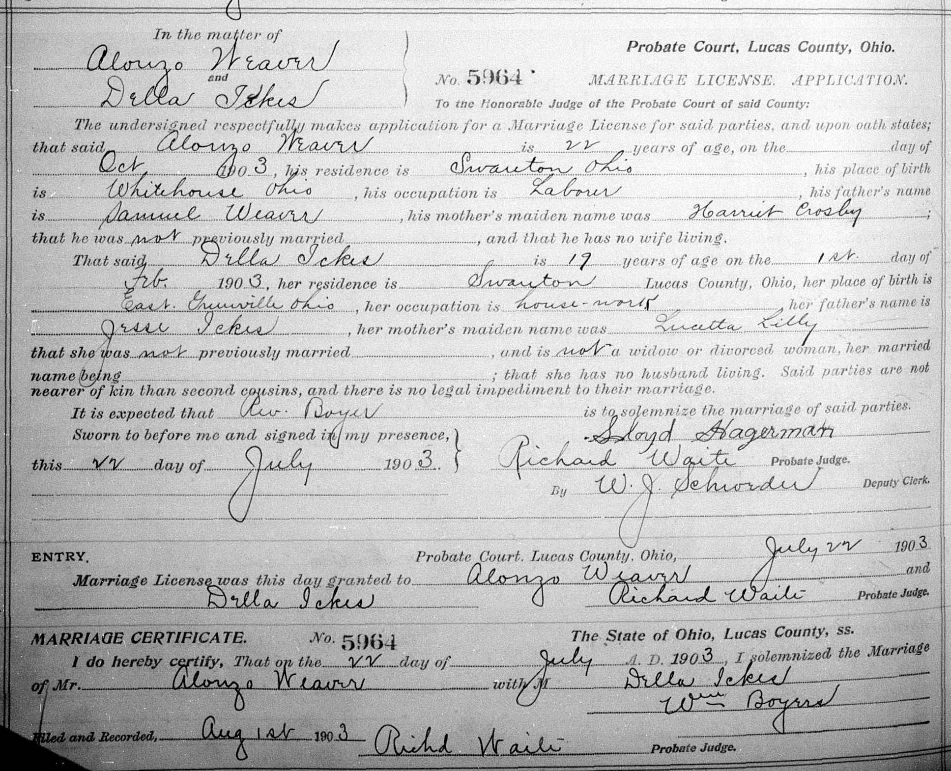 | Note | 1860 census (Sugar Creek Twp, OH): William Lilly (age 37/farmer), Margaret (31), Ruth (5), Lucetta (1). All born in Ohio, except Margaret born in PA. Same shows 3 Lilly family farms in a row. 1870 census (Sugar Creek Twp, OH): William Lilly (age 47/farmer), Margaret (41), Ruth (13), Lucetta (11), Emma (7). Several Lilly family farms in a row. The 1900 census for Swan Creek Twp, OH lists Jessie Ickes as a widowed female wash woman and head of household. I'm assuming they meant Mrs. Jessis Ickes, i.e., Lucetta. Therefore, Jessie died before this 1900 census. Five children living at home, but total of nine living children, therefore four more children grown and gone by 1900. |