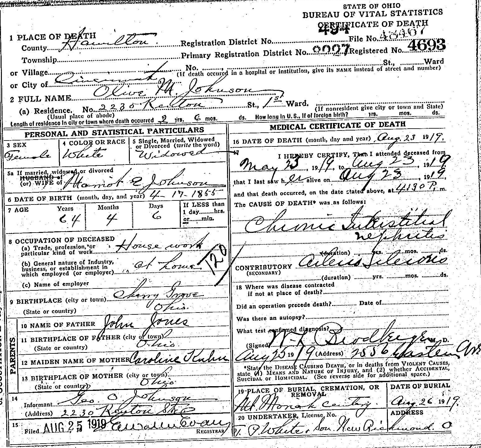 | Media object | Israel Jones Death Cert.jpg Format: image/jpeg Image dimensions: 2,759 × 2,599 pixels File size: 776 KB Type: Photo |
