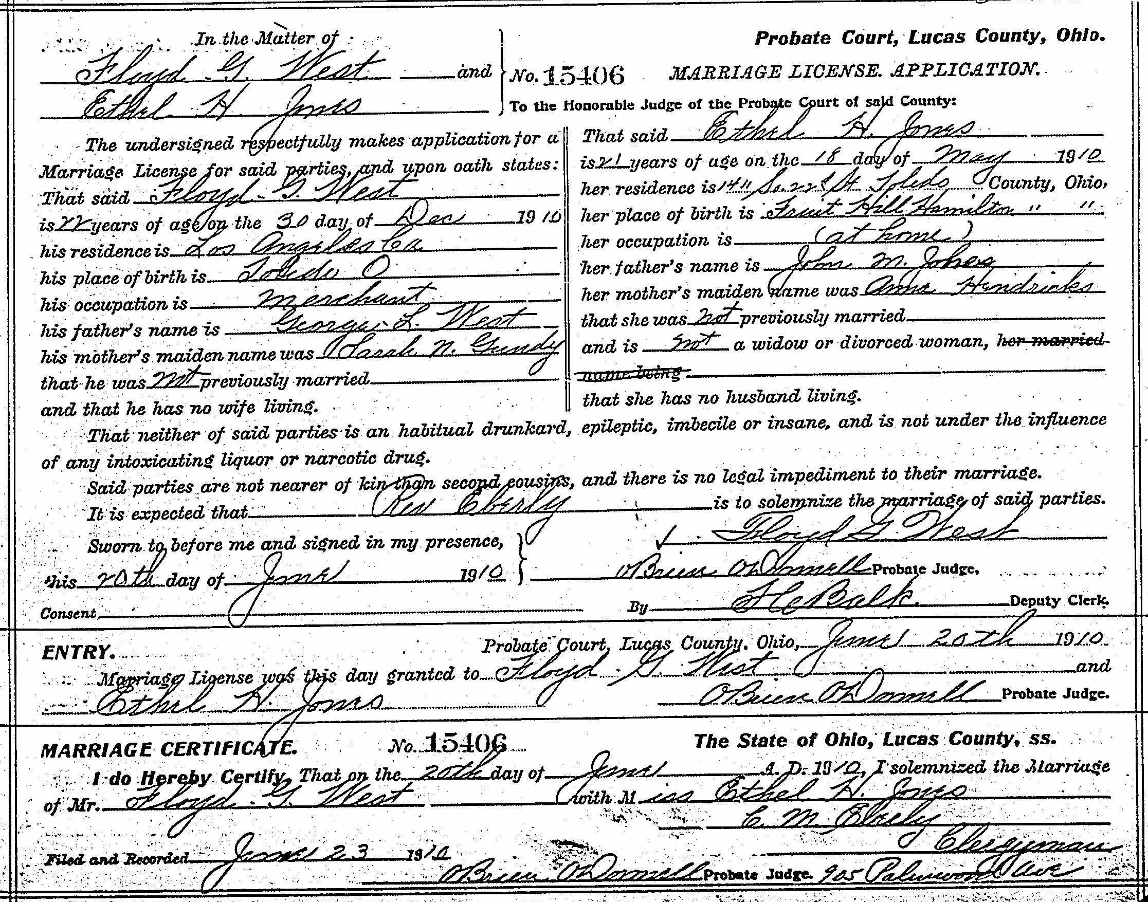 Marriage: June 20, 1910 — Toledo, OH |