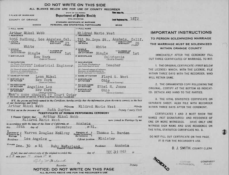 | Media object | West Webb Marriage Certificate.JPG Format: image/jpeg Image dimensions: 826 × 635 pixels File size: 121 KB Type: Photo |