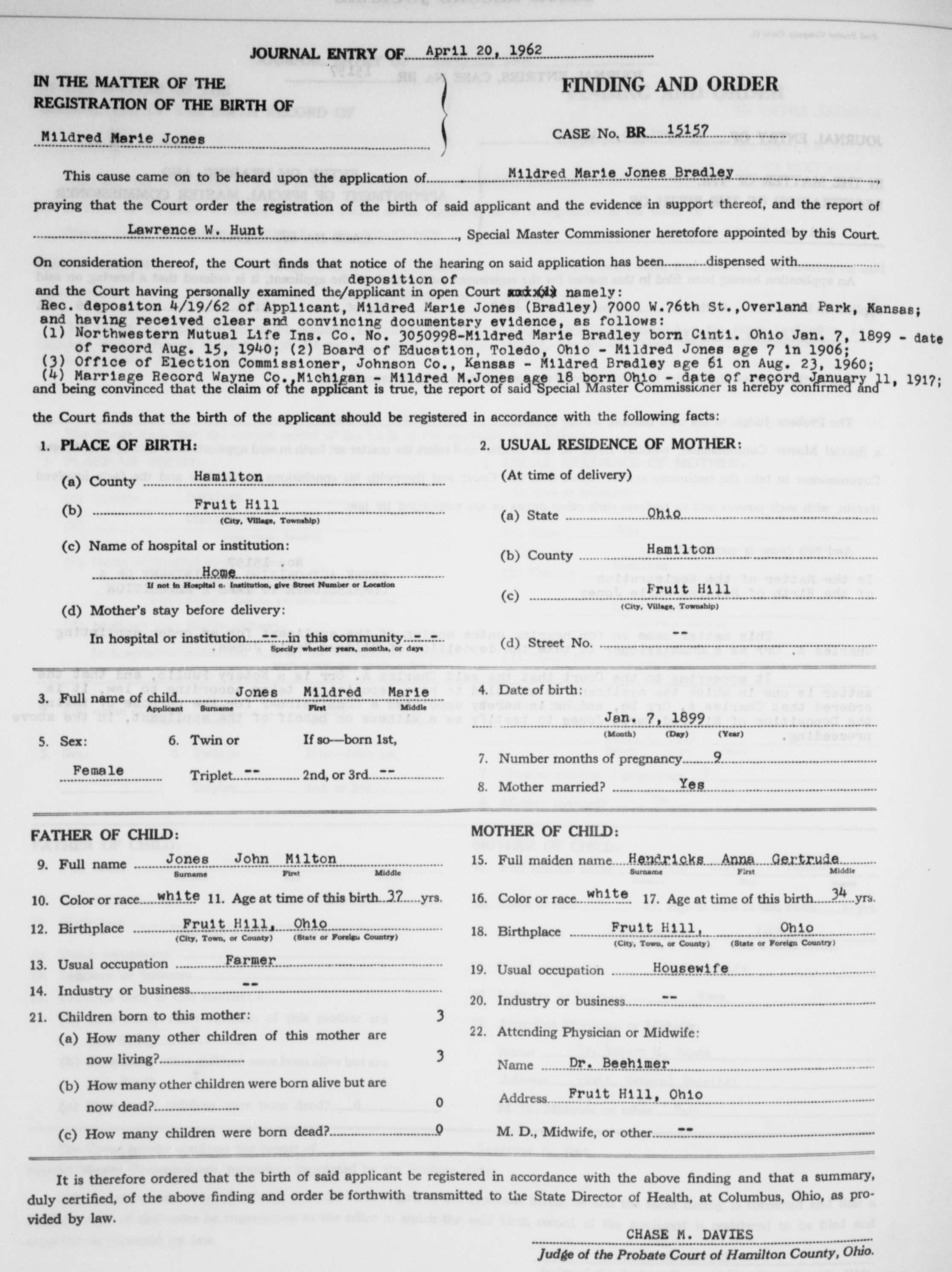 | Media object | Mildred Jones Birth Record.jpg Format: image/jpeg Image dimensions: 2,235 × 2,986 pixels File size: 1,714 KB Type: Photo |