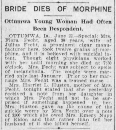 | Media object | Flora Drake Fecht suicide DeMoinesRegister 23Jun1908.JPG Format: image/jpeg Image dimensions: 382 × 429 pixels File size: 43 KB Type: Photo |