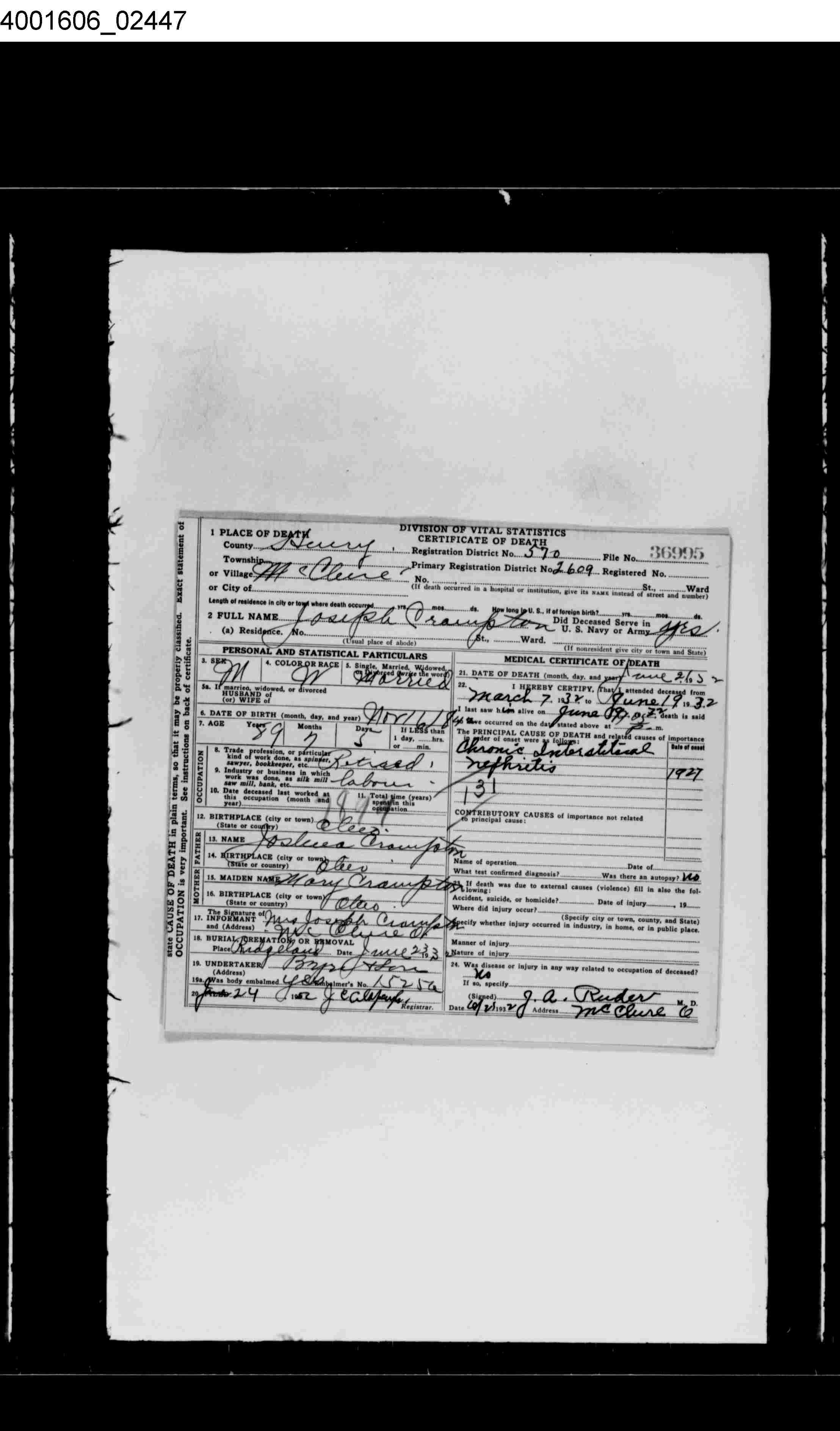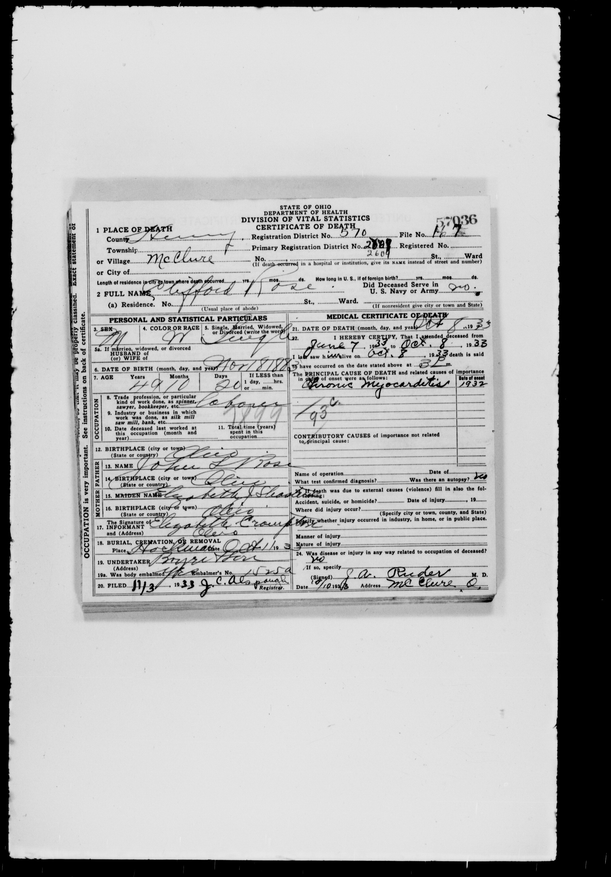 | Death of a brother | Clifford M Rose October 8, 1933 Cause: Chronic myocarditis |