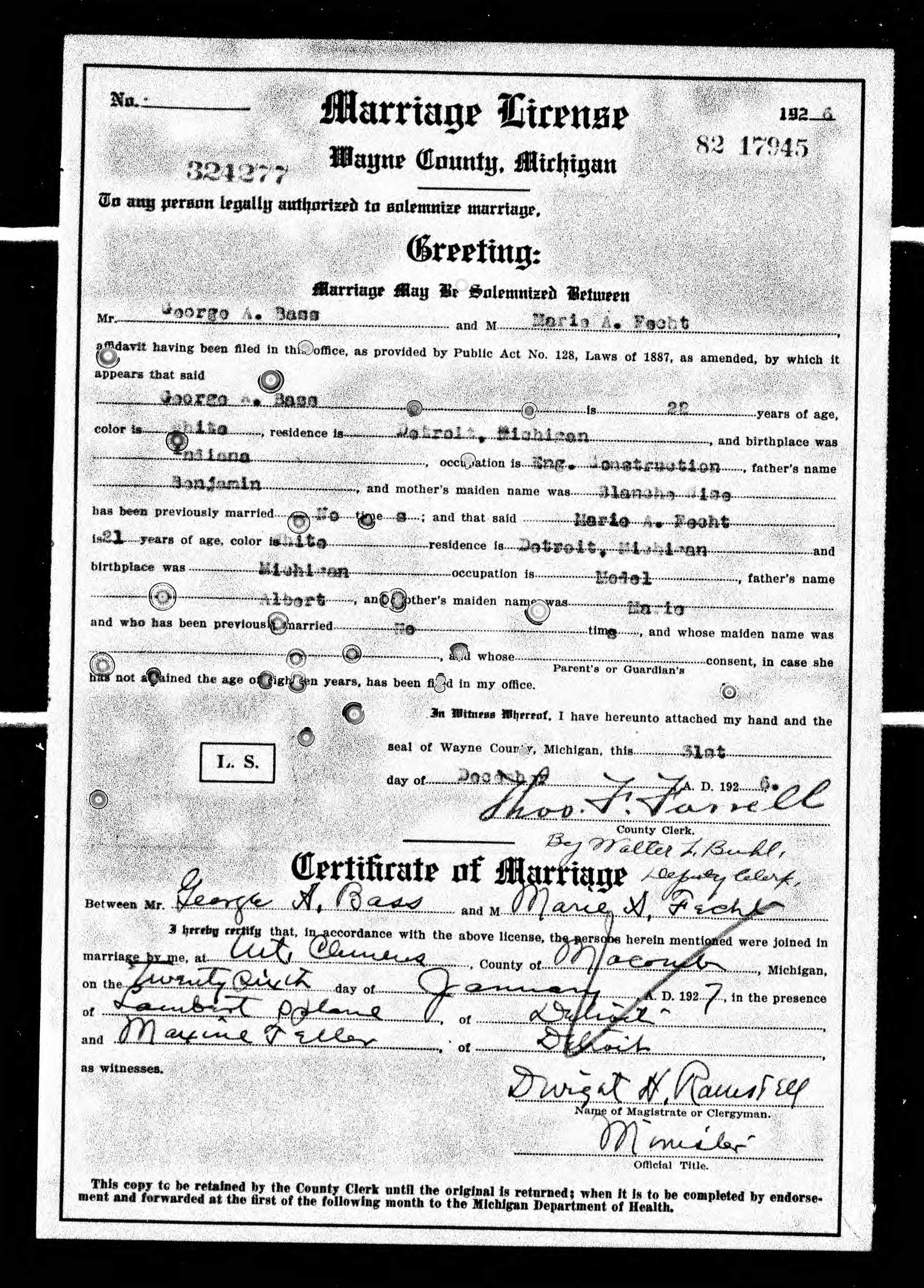 Marriage: February 26, 1927 — Mt. Clemons, MI |