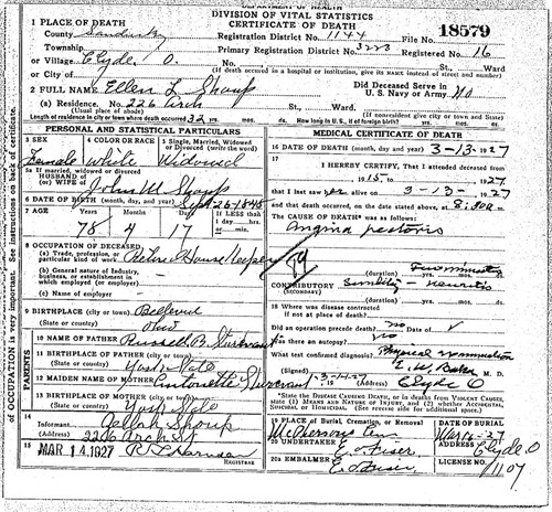 | Media object | Ellen Sturtevant Death Cert.jpg Format: image/jpeg Image dimensions: 500 × 464 pixels File size: 125 KB Type: Photo |