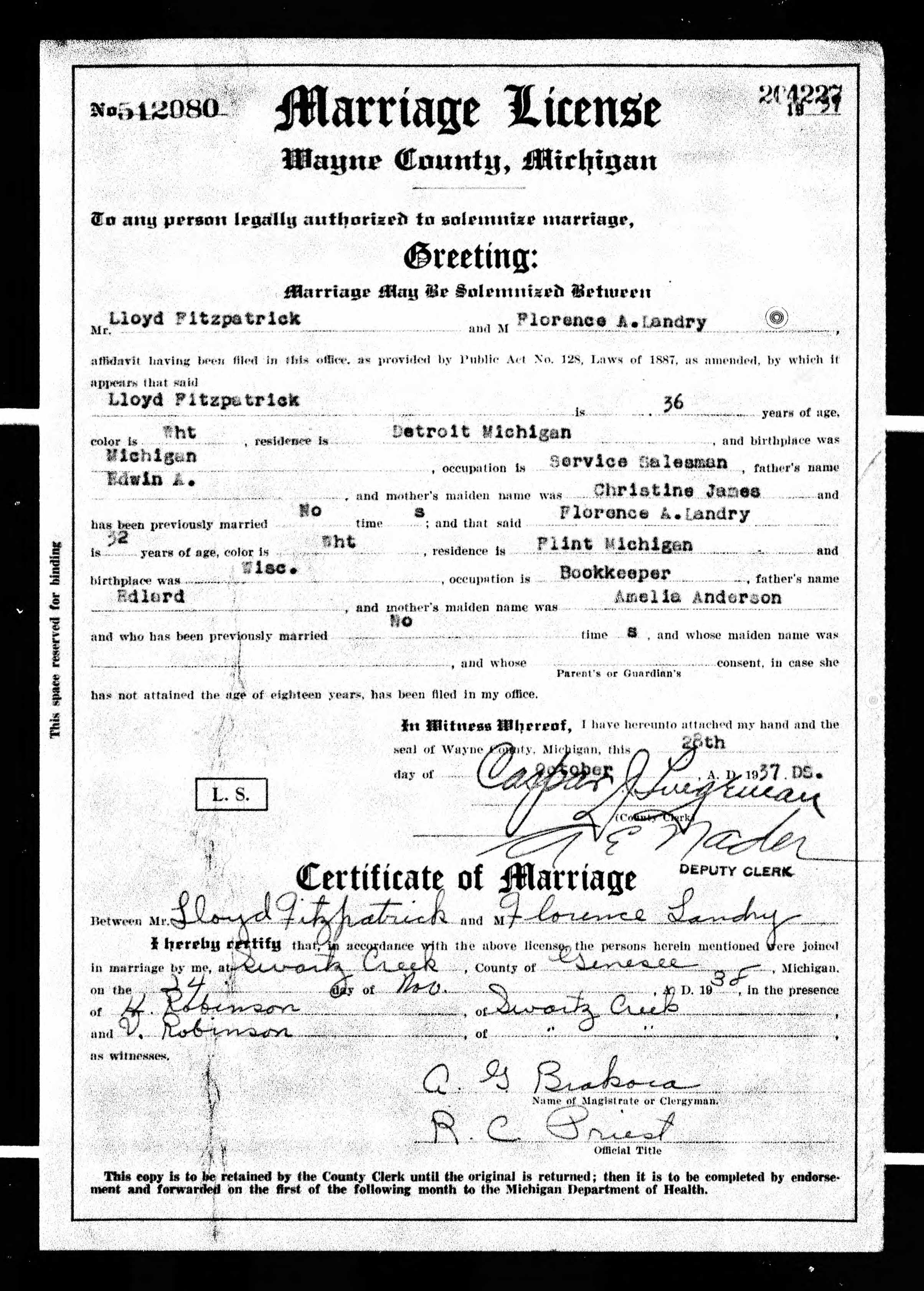 | Media object | LloydFitzFloranceLandryMarriageCert.jpg Format: image/jpeg Image dimensions: 2,408 × 3,364 pixels File size: 829 KB Type: Photo |