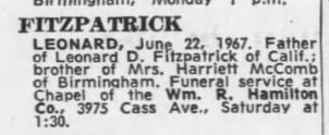 | Media object | Leonard Fitspatrick death notice DetFreePress 24Jun1967.JPG Format: image/jpeg Image dimensions: 302 × 124 pixels File size: 17 KB Type: Photo |