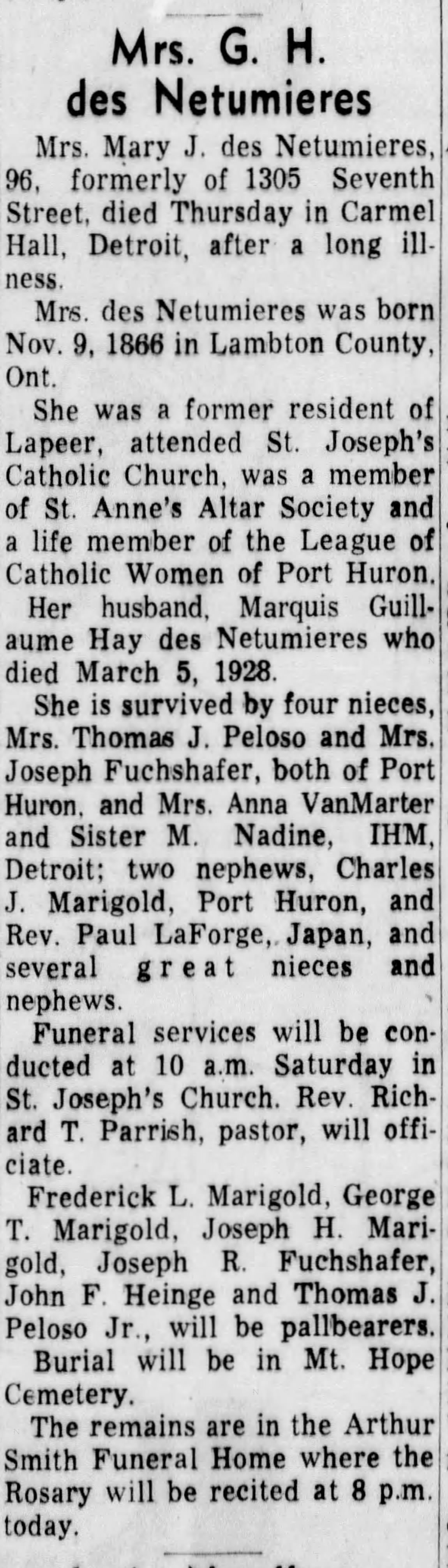| Death | Mary was living in Carmel Hall (home for the elderly), formerly the Detroiter Hotel, at 2560 Woodward Ave. |