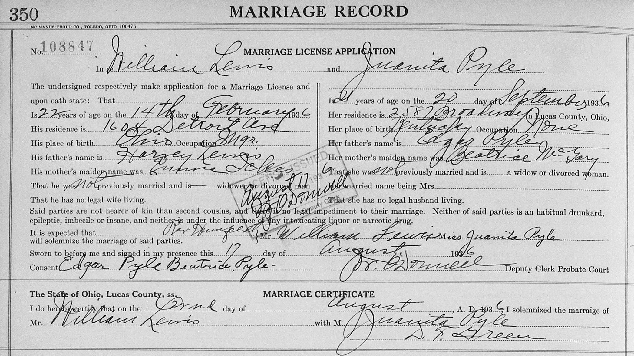 | Media object | Wm Lewis_Juanita Pyle Marriage Record.jpg Format: image/jpeg Image dimensions: 2,094 × 1,175 pixels File size: 1,515 KB Type: Photo |