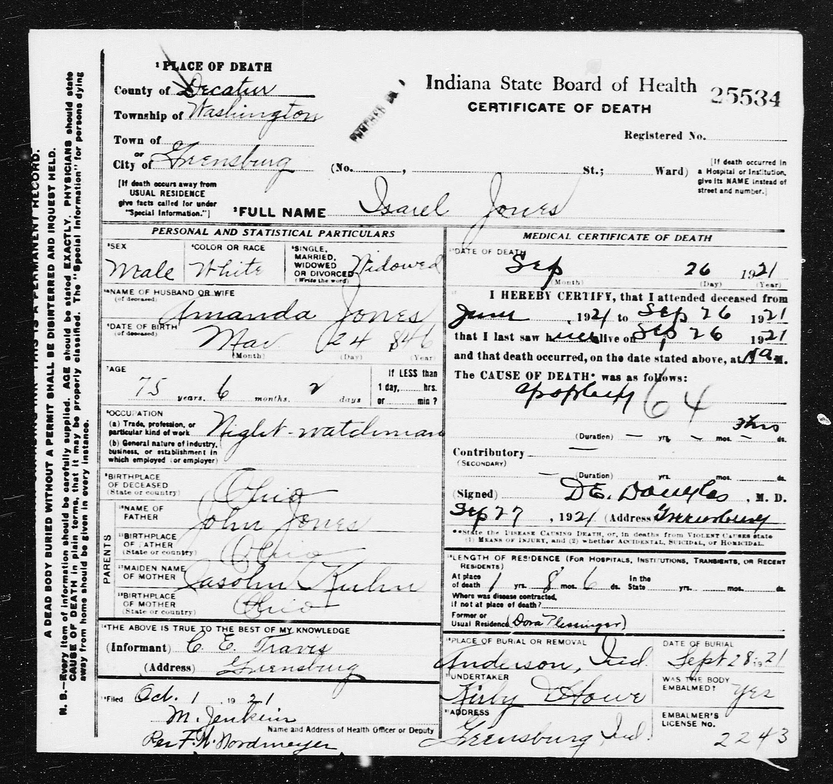 | Media object | Israel Jones Death Cert.jpg Format: image/jpeg Image dimensions: 2,759 × 2,599 pixels File size: 776 KB Type: Photo |
